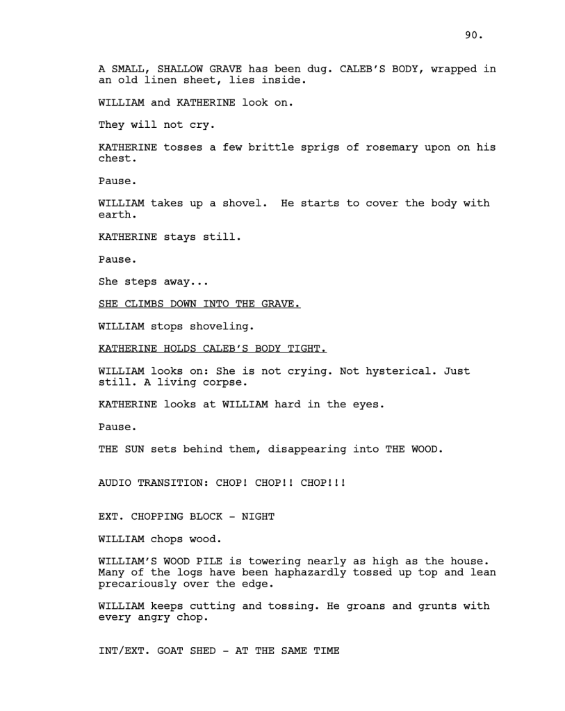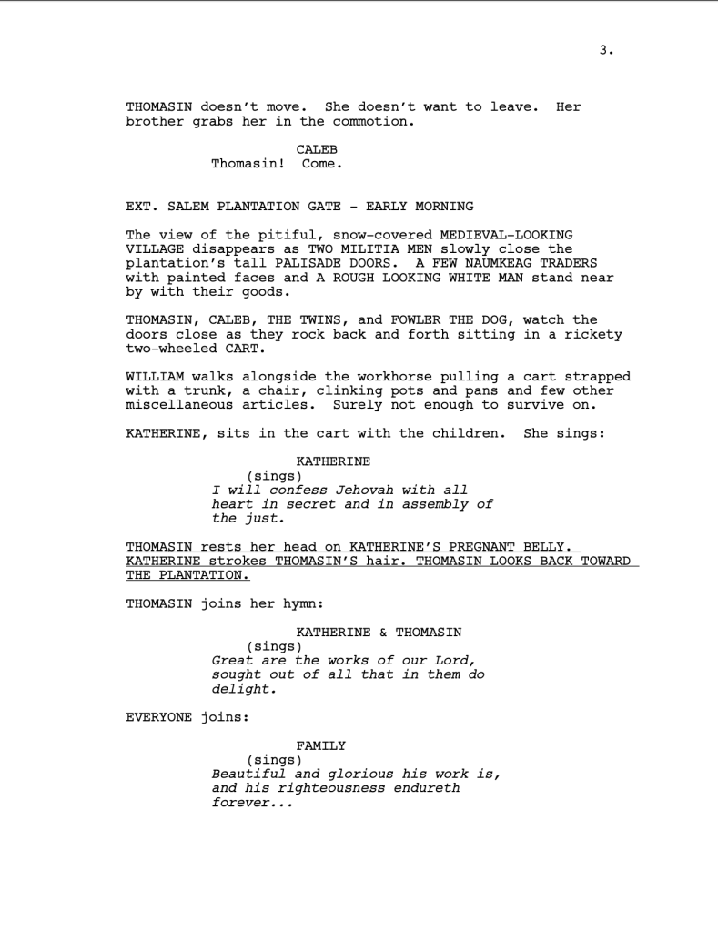 On the following page of The Witch screenplay, Eggers uses intentional pauses, making it clear how the pace will feel onscreen: