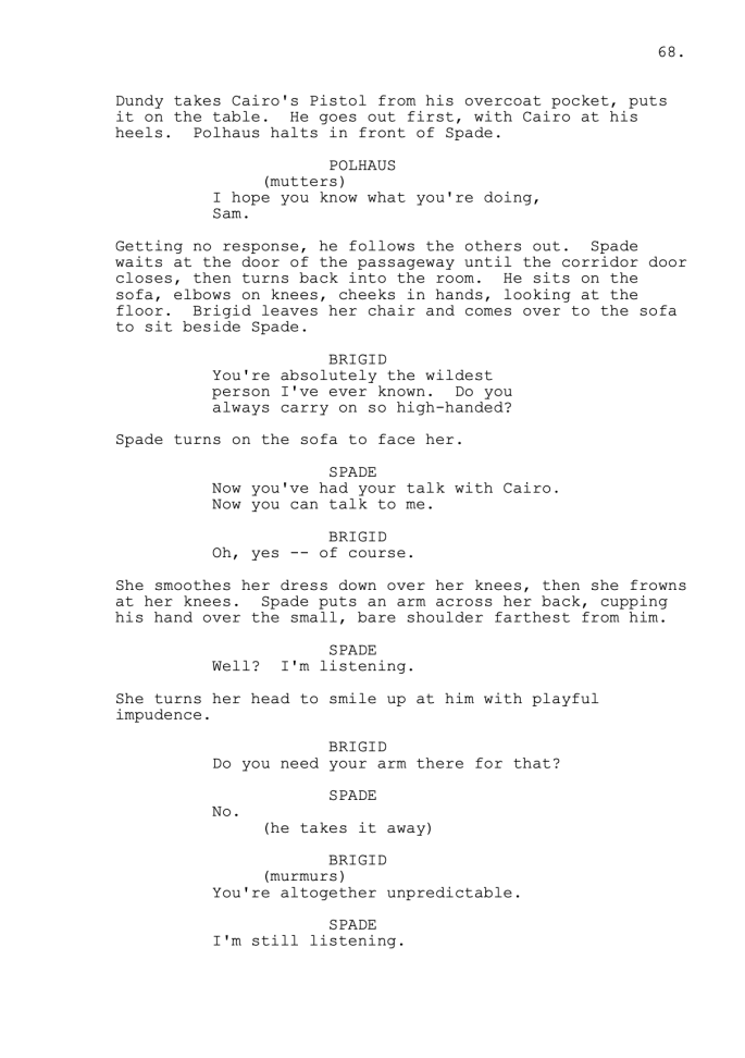 Later, Brigid murmurs, “You’re altogether unpredictable.” If Spade were predictable, the story would likely be far less interesting. His choices are active and unpredictable. That’s what keeps the story moving.