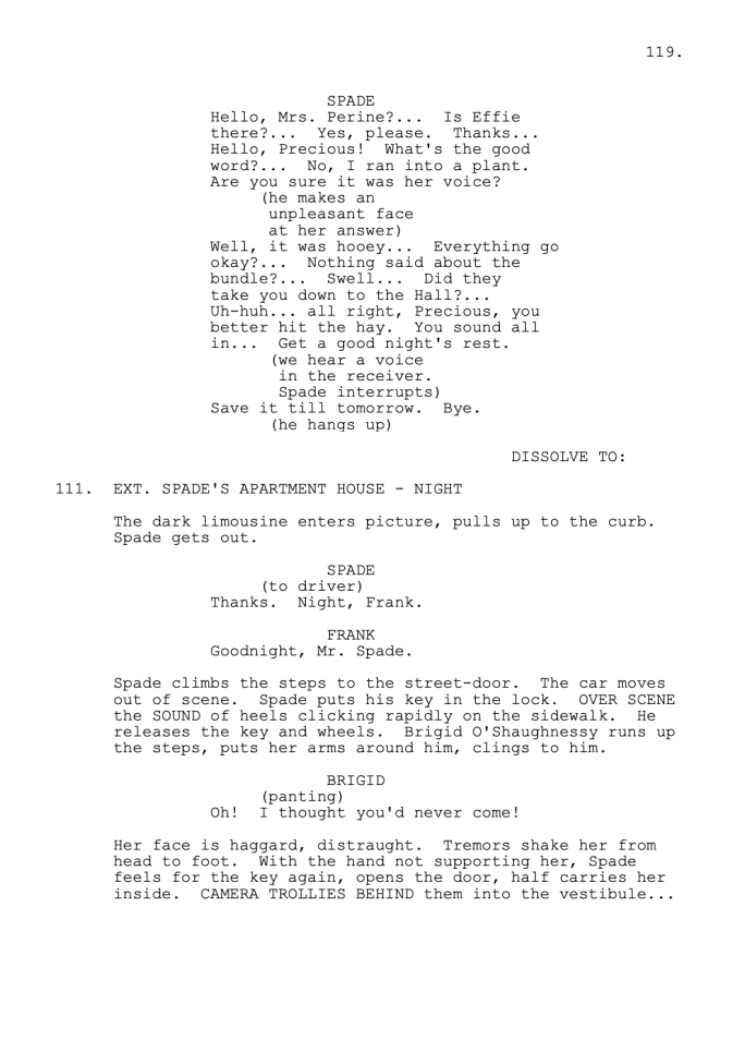 On the following page of The Maltese Falcon screenplay, Spade has a phone conversation revealing his personality in subtle ways, then takes a limousine to Brigid’s apartment: