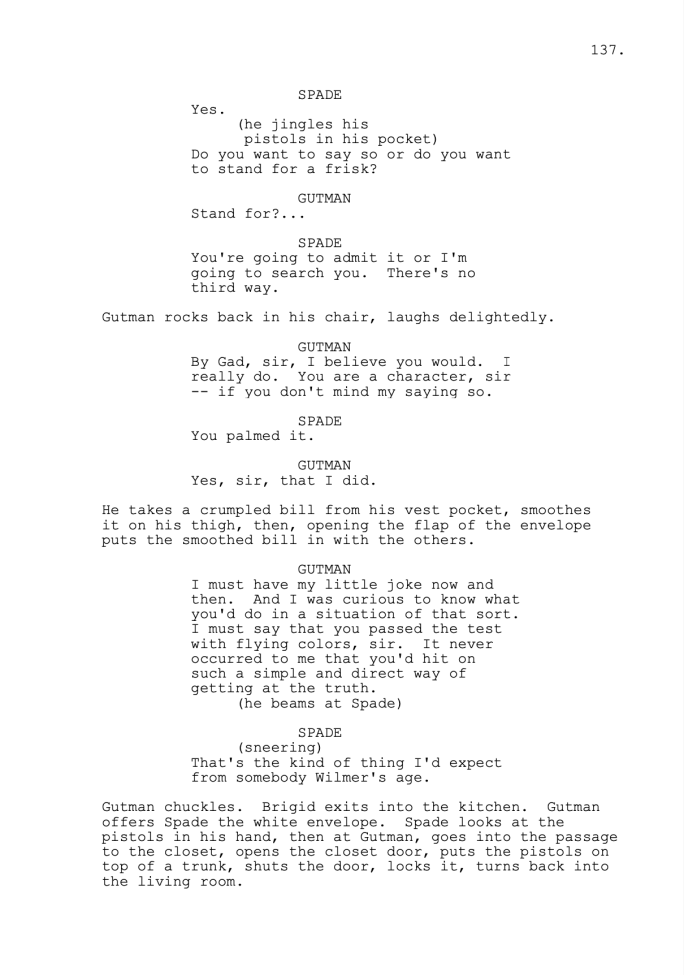 On the following page of The Maltese Falcon screenplay, Spade calls out Gutman for “palming” one of the bills: